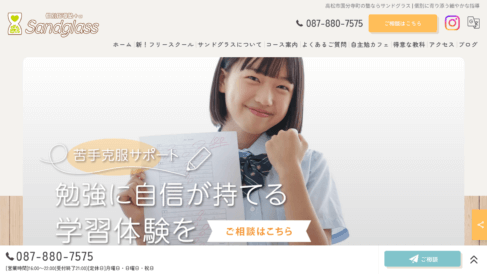 Privateスクール個別指導塾+α Sandglassは、努力しているのに成績が伸びない悩みを抱える生徒が目標を超えられるよう支援する学習塾です。香川県高松市国分寺町に位置し、プロのカウンセラーでもある塾長が勉強面だけでなく気持ちの面から「失われた自信」を取り戻すアプローチを実践しています。やる気と自信を身につけられるよう塾長が責任を持ってフォローし、努力してきた経験を確実に成果へとつなげる指導体制を構築しています。